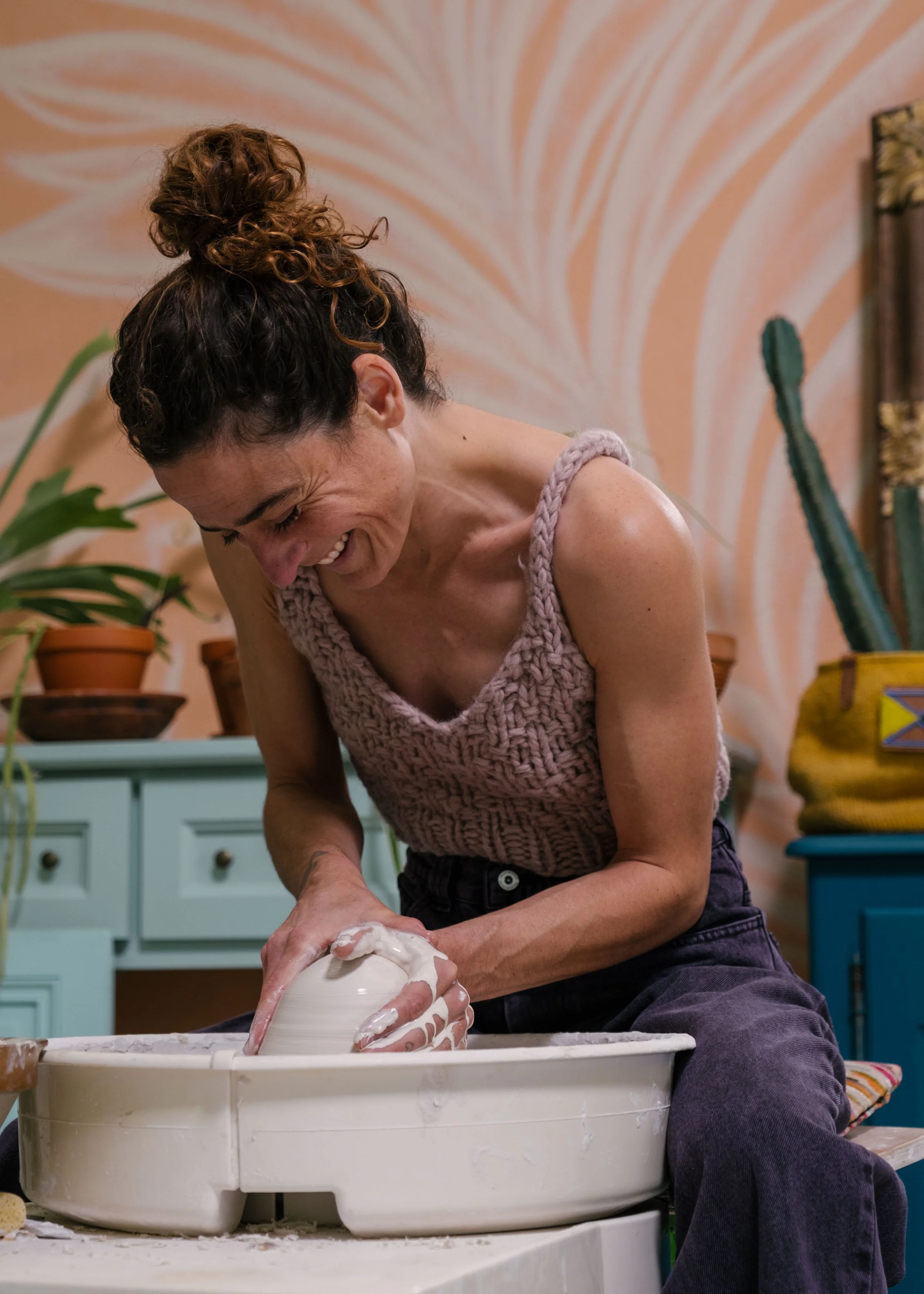 Sur mon tour de potier, je façonne chaque objet, puis je le sculpte et le décore avec des engobes, des jus d’oxydes et des émaux.